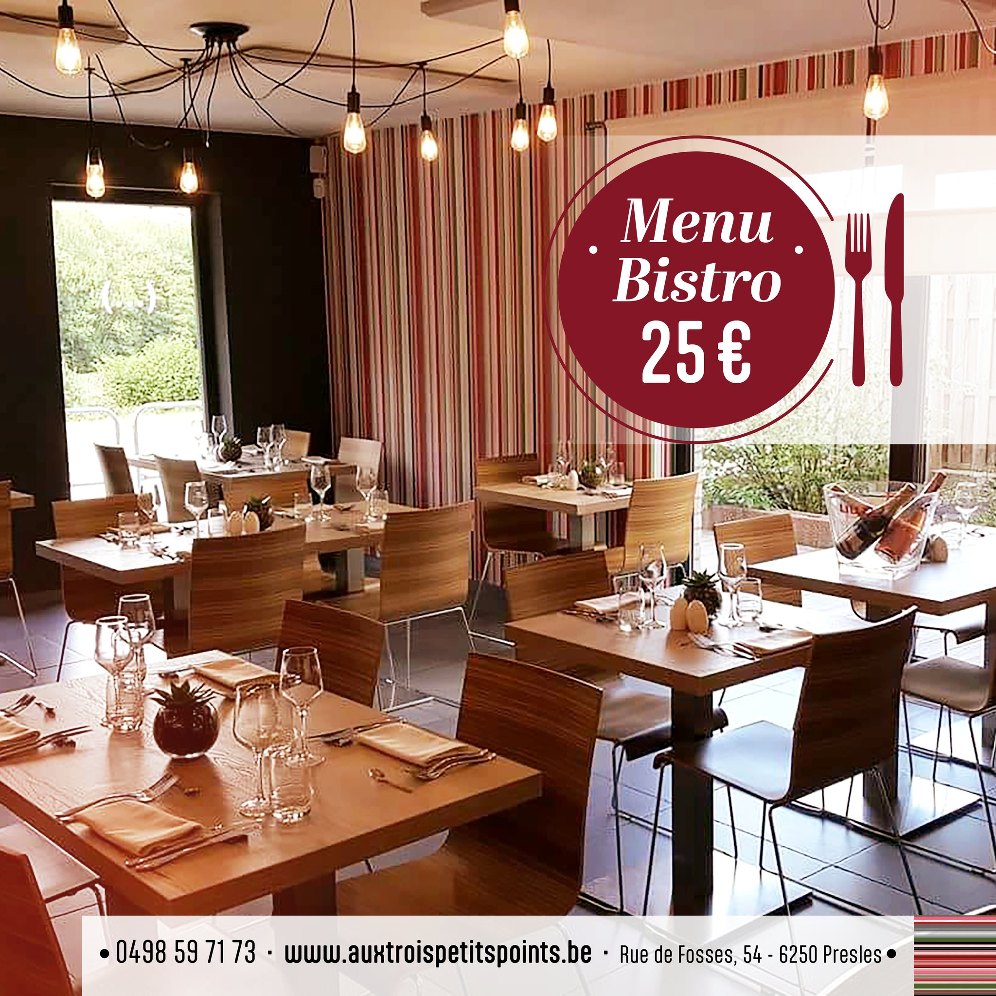 Notre restaurant se situe entre Châtelet à 3km Fosses-la-Villeà 5km Gerpinnesà 6km et Sambre-Ville 7km